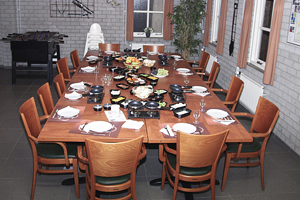 Op de begane grond bevinden zich de keuken, eetzaal, recreatieruimte en een aantal douches en toiletten.