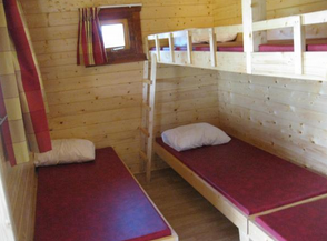 twee stapelbedden en een enkel bed met matrassen, kussens en bovenbedbeveiliging